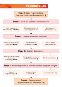 C’est dans cette logique que Spirale Formation propose un exemple de parcours HAS en 6 étapes complémentaires, à déployer selon le calendrier de l’établissement.